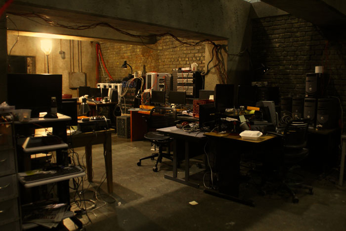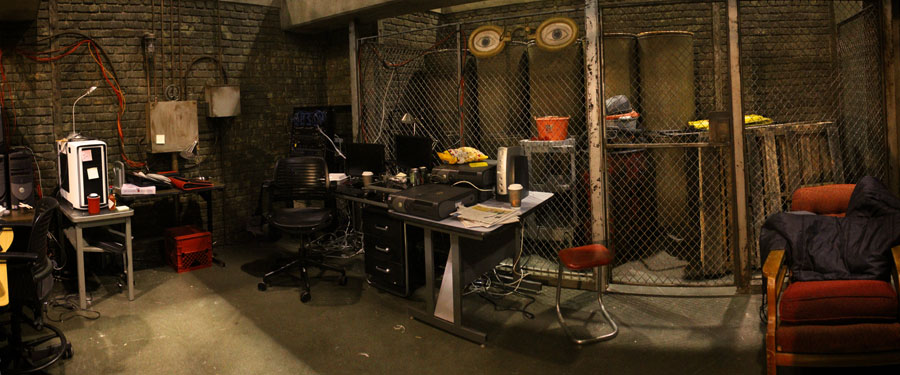 ![]() This was the "lair" of a hacker, who had a rag-tag crew working here. But he's a good guy, helping our detective with a case. This set was an example of how locations often inform designs of sets on stage. The original concept for this set was that it was a disused store that our guy had set up in. But we found a great location for the street entrance that was a ramp leading down to the basement of a large building, so we rethought this set, making it windowless, and with very low and heavy beams across the top. This was the end of the road for the apartment set. After six different configurations we used the bones of it as the walls for this set. Afterward, the walls were covered with heavy texture and artificial brick and the set had to be struck to make room for a motel room set. |