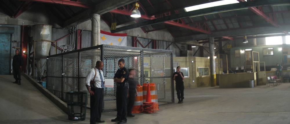 The police station was a makeshift one, set up in a warehouse because the real police station had been destroyed in Katrina.