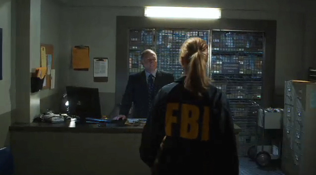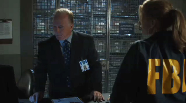 The evidence room of a FBI field office. Beyond the grating were three rows of shelves with plastic bins, which