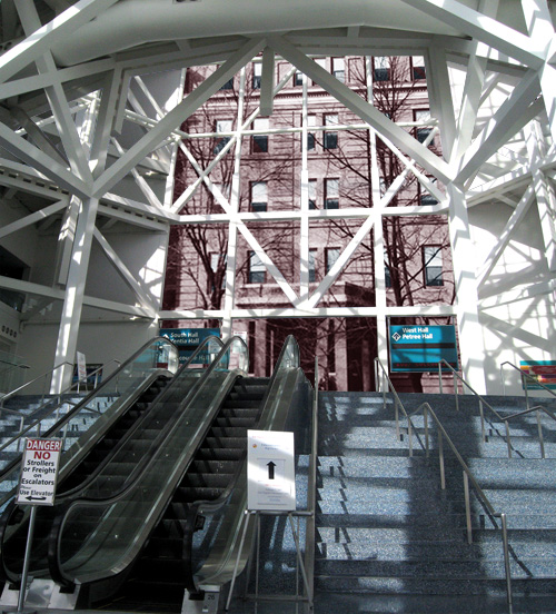 The concept for the lobby was that it was part of a massive ultra-modern addition