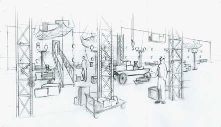 This is sketch of our Ellis Island set -- just a quick one to work out the concept.