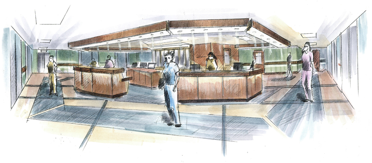 The concept for the hospital lobby was that an untra-modern addition had been built onto